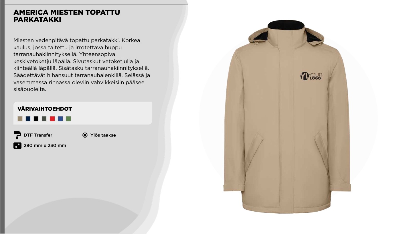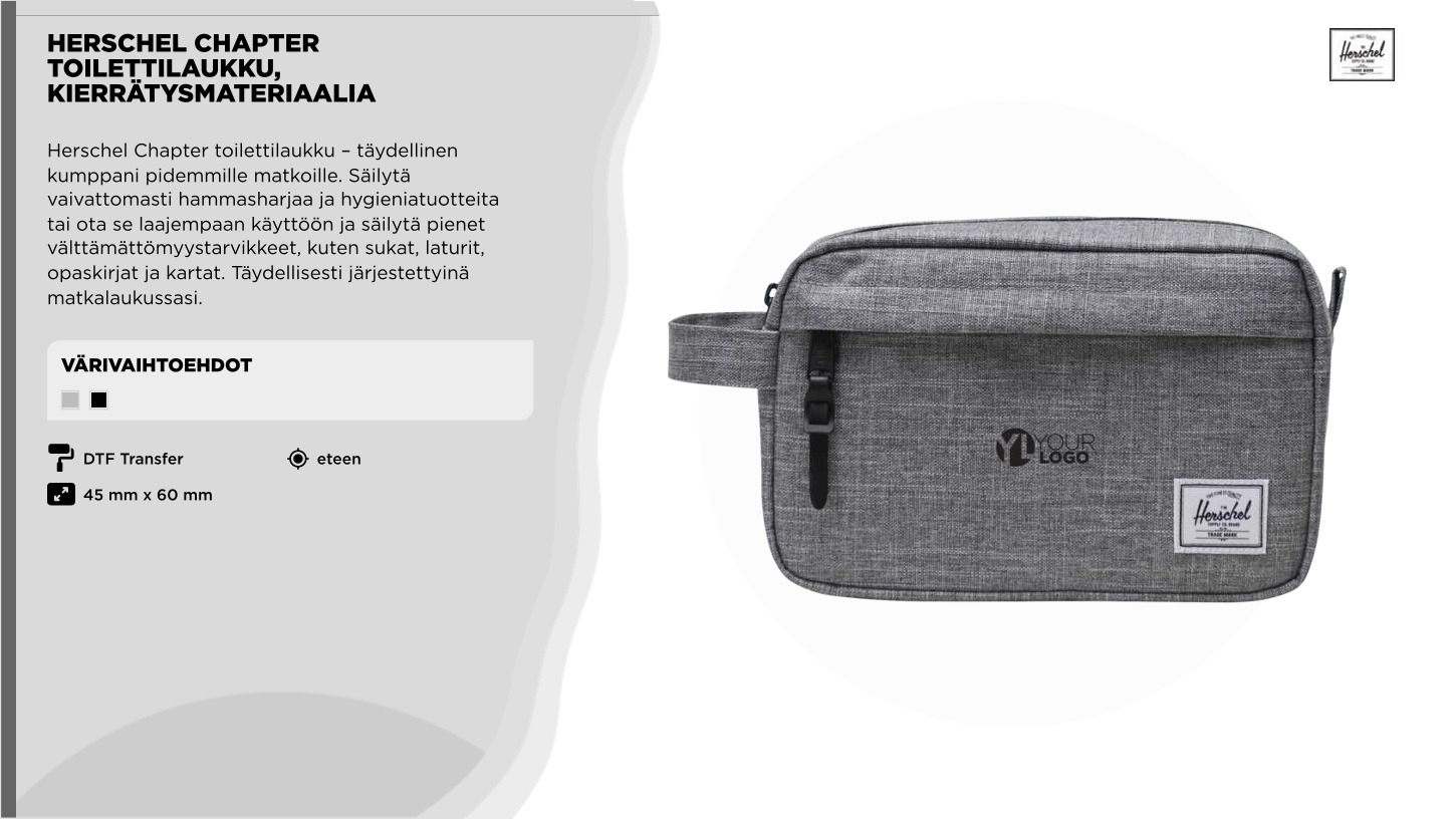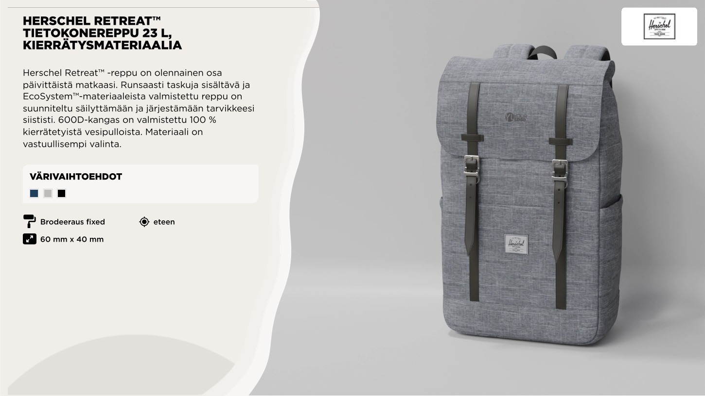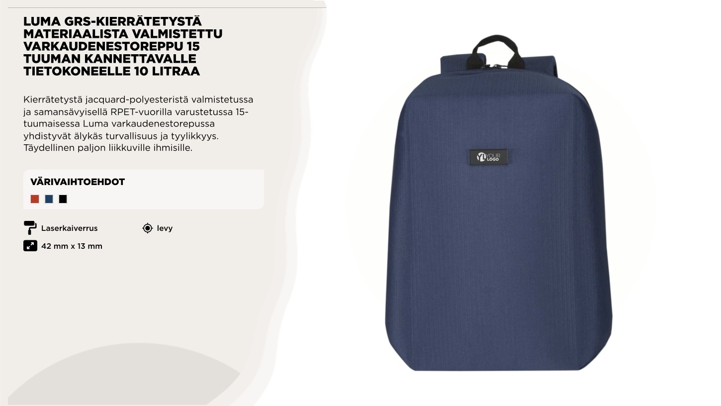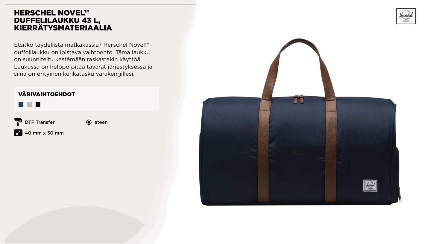 Kun löydät mielenkiintoisen tuotteen, kirjoita ylös tuotenumero/koodi ja nimi ja kerro monestako kappaleesta olet kiinnostunut. Jos sinulla on valmiina merkkauksessa käytettävä logoaineisto, voit lähettää tiedustelusi logoineen asiakaspalvelu@hevitex.fi sähköpostiin. Teemme tarjouksen myös ilman valmista aineistoa.
