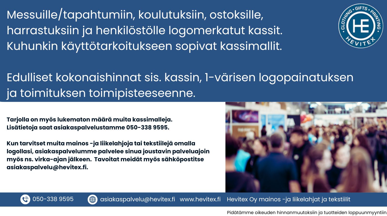 Kun löydät mielenkiintoisen tuotteen, kirjoita ylös tuotenumero/koodi ja nimi ja kerro monestako kappaleesta olet kiinnostunut. Jos sinulla on valmiina merkkauksessa käytettävä logoaineisto, voit lähettää tiedustelusi logoineen asiakaspalvelu@hevitex.fi sähköpostiin. Teemme tarjouksen myös ilman valmista aineistoa.