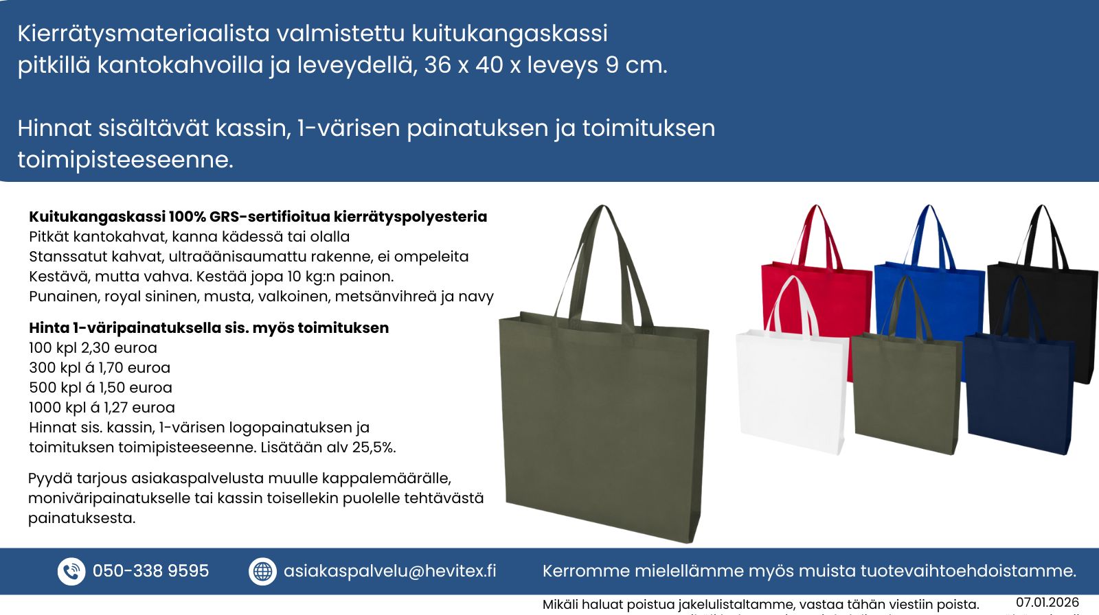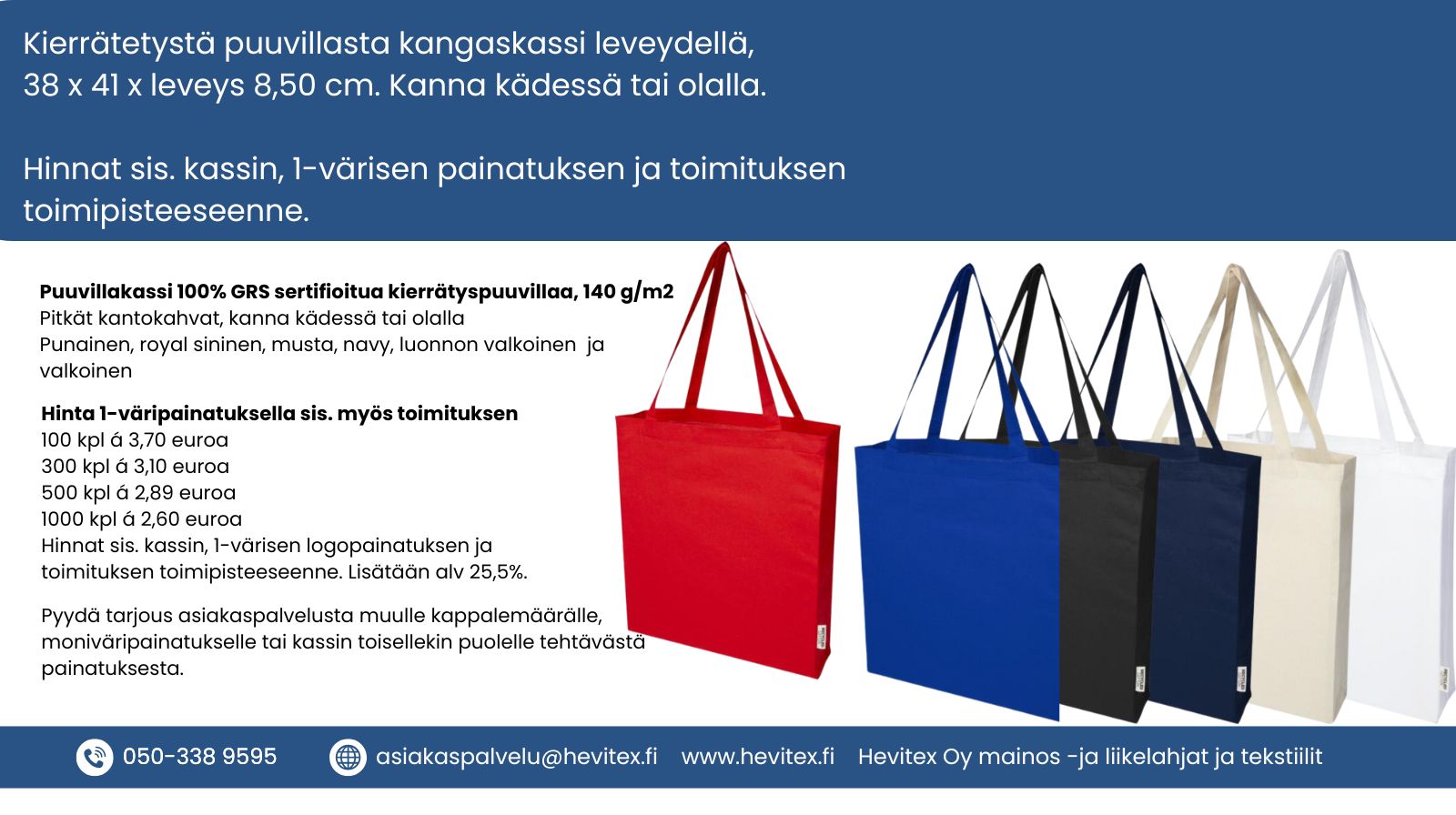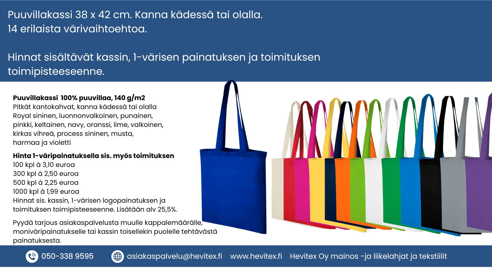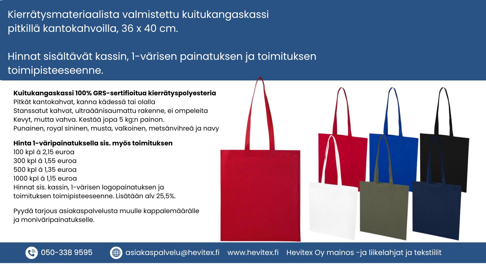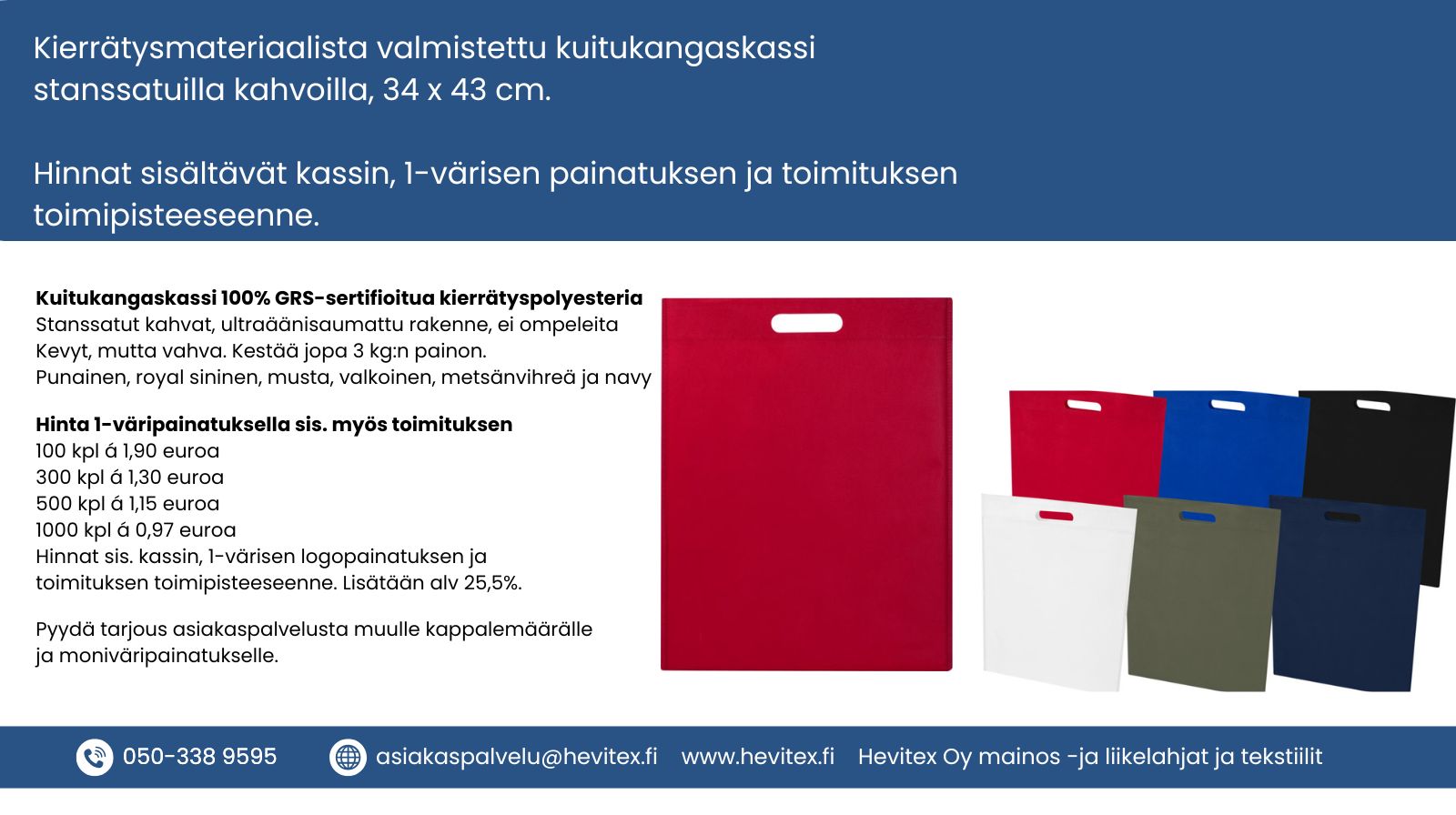 Kokonaishinnat sisältävät kassin, 1-väripainatuksen ja toimituksen toimipisteeseenne. Vain arvonlisävero 25,5% lisätään hintoihin.